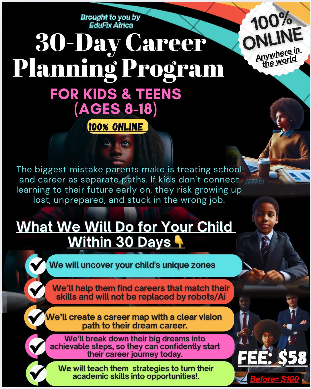 This Program uses Our Innovative 5-in-1 proven Holistic Approach for Career Success to create a sustainable career path for your child that is:👉AI and Passion-Driven👉Financially Stable👉Future-Proof👉Built on Ethical Integrity👉ResilientThis program isn’t about career advice, it’s about setting your child up for success today for a better tomorrow.